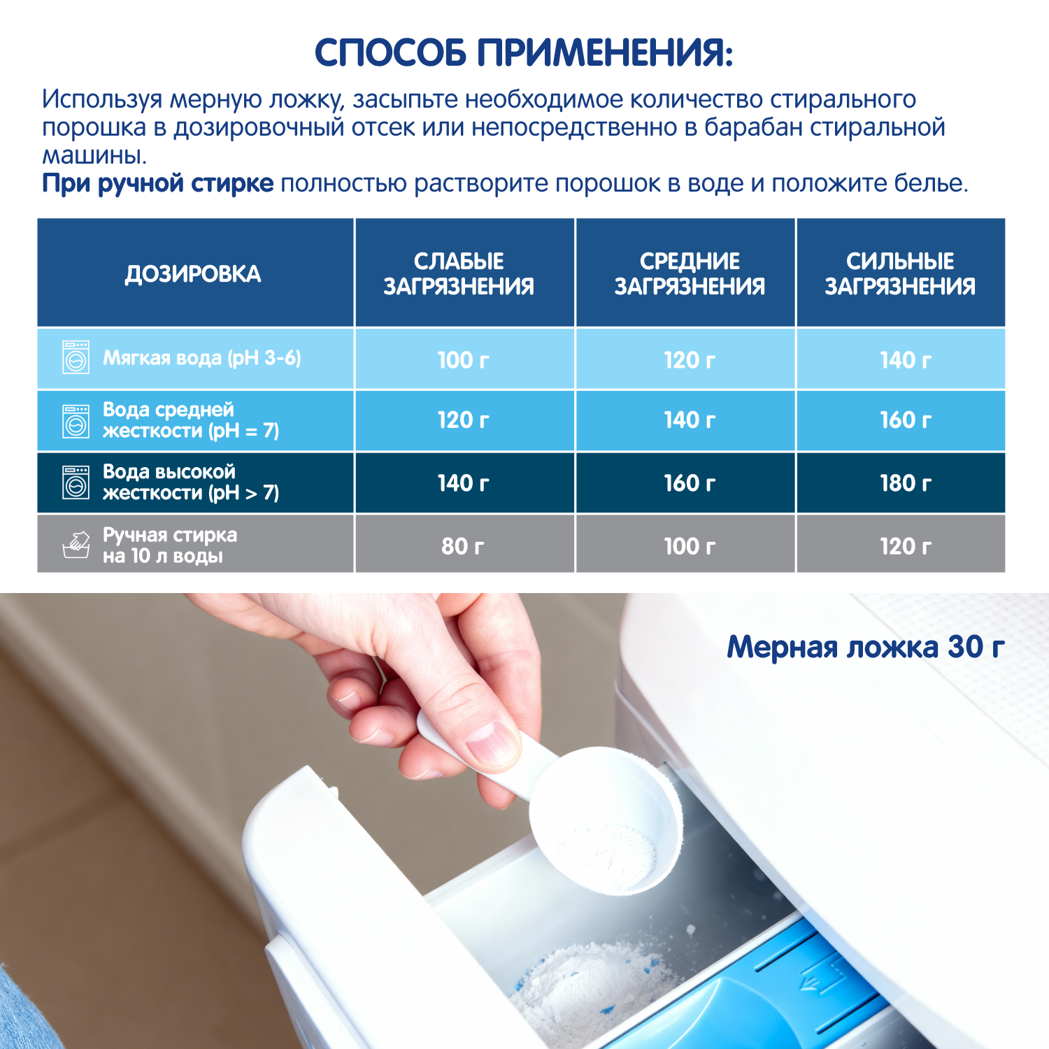Способ применения: при выборе режима стирки и температуры следуйте рекомендациям, указанным на ярлыках ваших изделий. Используя мерную ложку, засыпьте необходимо количество стирального порошка в дозировочный отсек или непосредственно в барабан стиральной машины. При ручной стирке полностью растворите порошок в воде и положите белье.